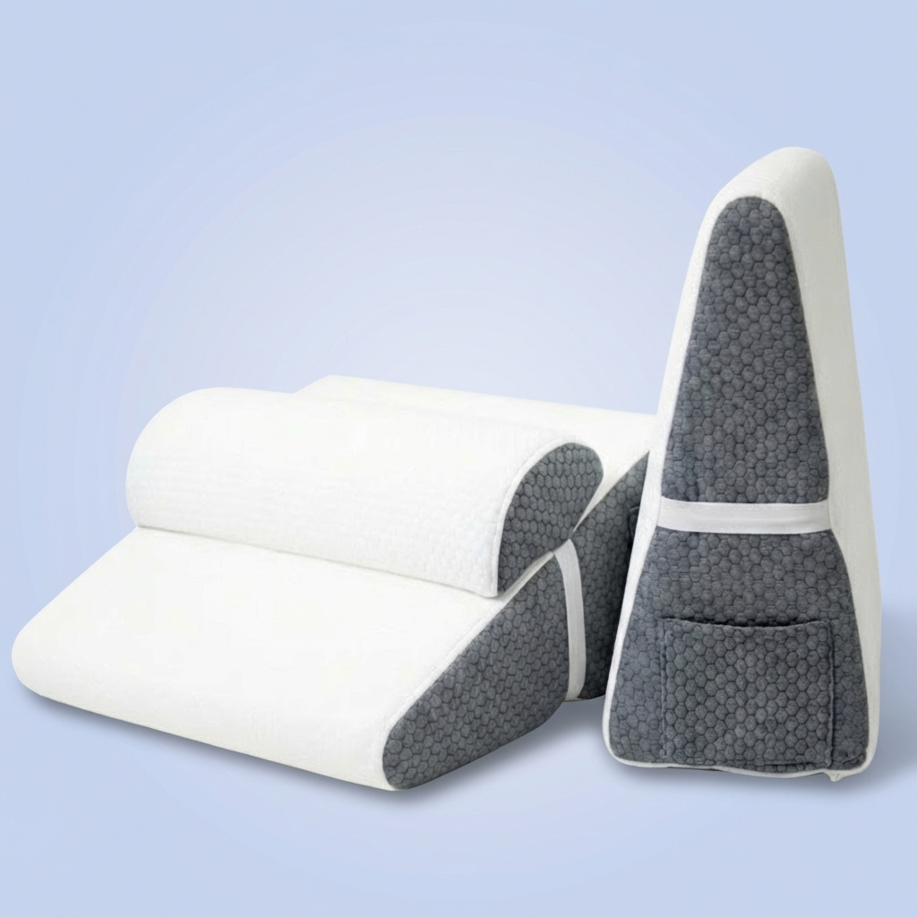 Crafted from premium high-density memory foam sourced from trusted suppliers. Each pillow is carefully designed at a precise 27° angle for optimal comfort and support — ensuring durability and a deep, restorative sleep experience. Includes the wedge pillow, contoured neck support pillow, and a free 100% light-blocking silk sleep mask.